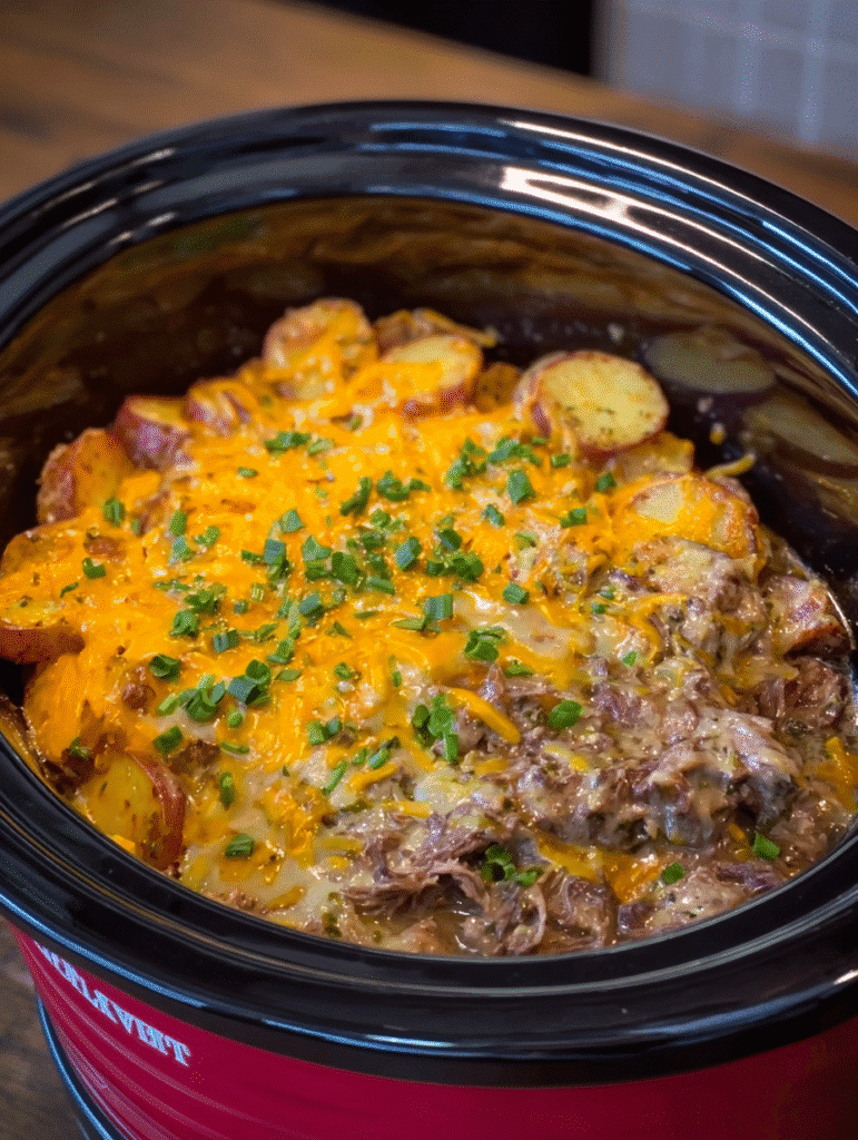 - Cover and cook on LOW for 7–8 hours or HIGH for 4–5 hours, until potatoes are tender and beef is fork-tender.