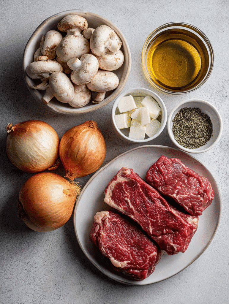 Before we dive in, gather these simple ingredients for your Crockpot Steak, Mushroom & Onions Dinner:
