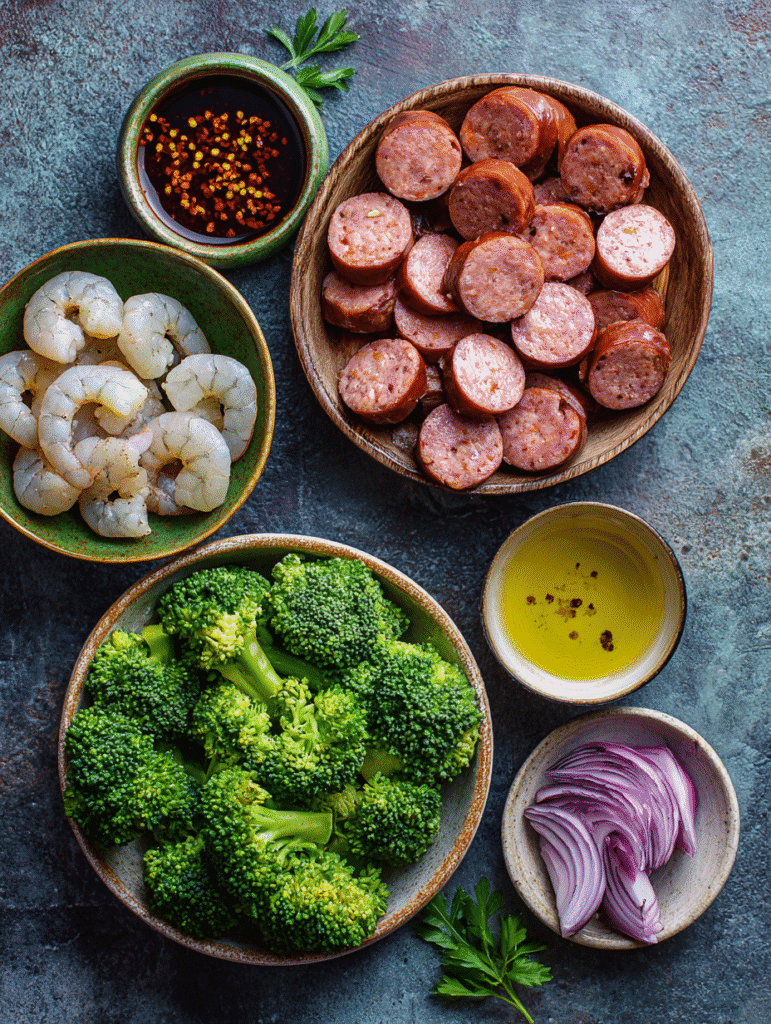 - Prepare the ingredients: Rinse the shrimp and pat dry. Slice the smoked sausage and trim the broccoli into bite‑sized florets for your Honey Garlic Shrimp, Sausage & Broccoli.