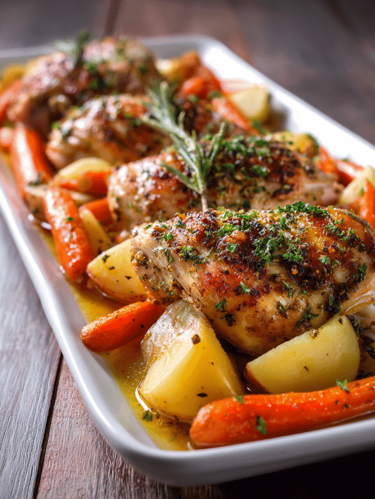 Bake in the preheated oven for 40–45 minutes, or until the chicken skin is crispy and the internal temp hits 165°F. The carrots and potatoes should be tender and golden.