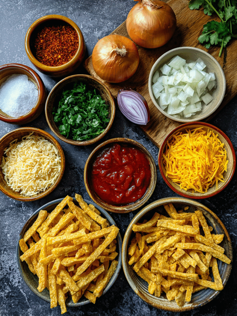 Each ingredient plays a role in building the perfect plate of Taco Fries with Crispy Tortilla Strips, from the crispy base to the flavorful toppings.